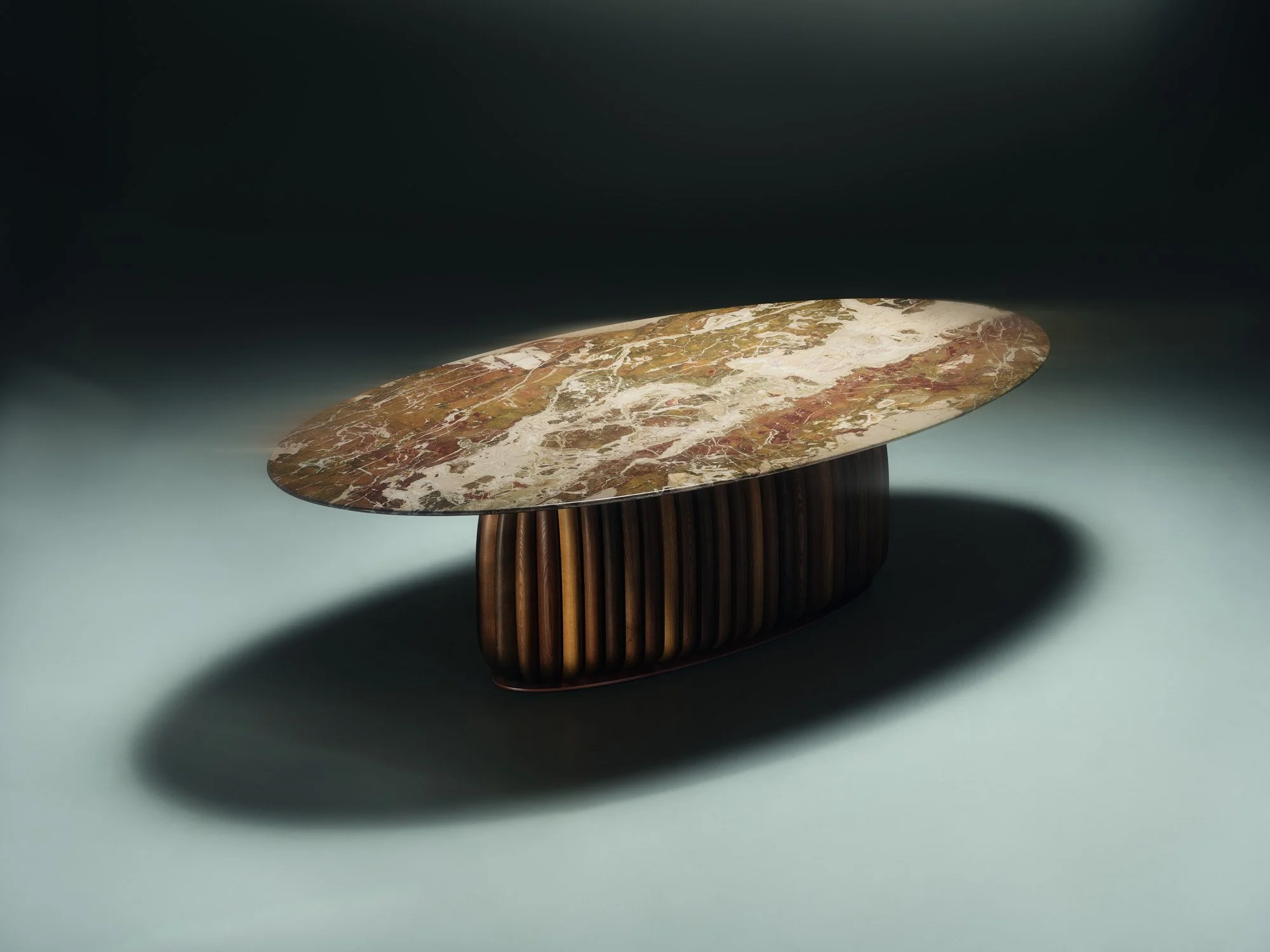 If Fantino is about protection, Macrodosing introduces tension. Conceived as a dining table, the piece abstracts the duality of the mushroom—simultaneously nourishing and intoxicating, organic yet otherworldly. A dense vertical structure composed of rhythmic wooden ribs rises from the ground, supporting a wide stone surface that unfolds like a canopy. The table doesn’t simply occupy space; it commands it. And yet, there’s restraint in its execution—a quiet strength that allows its more enigmatic qualities to surface over time.