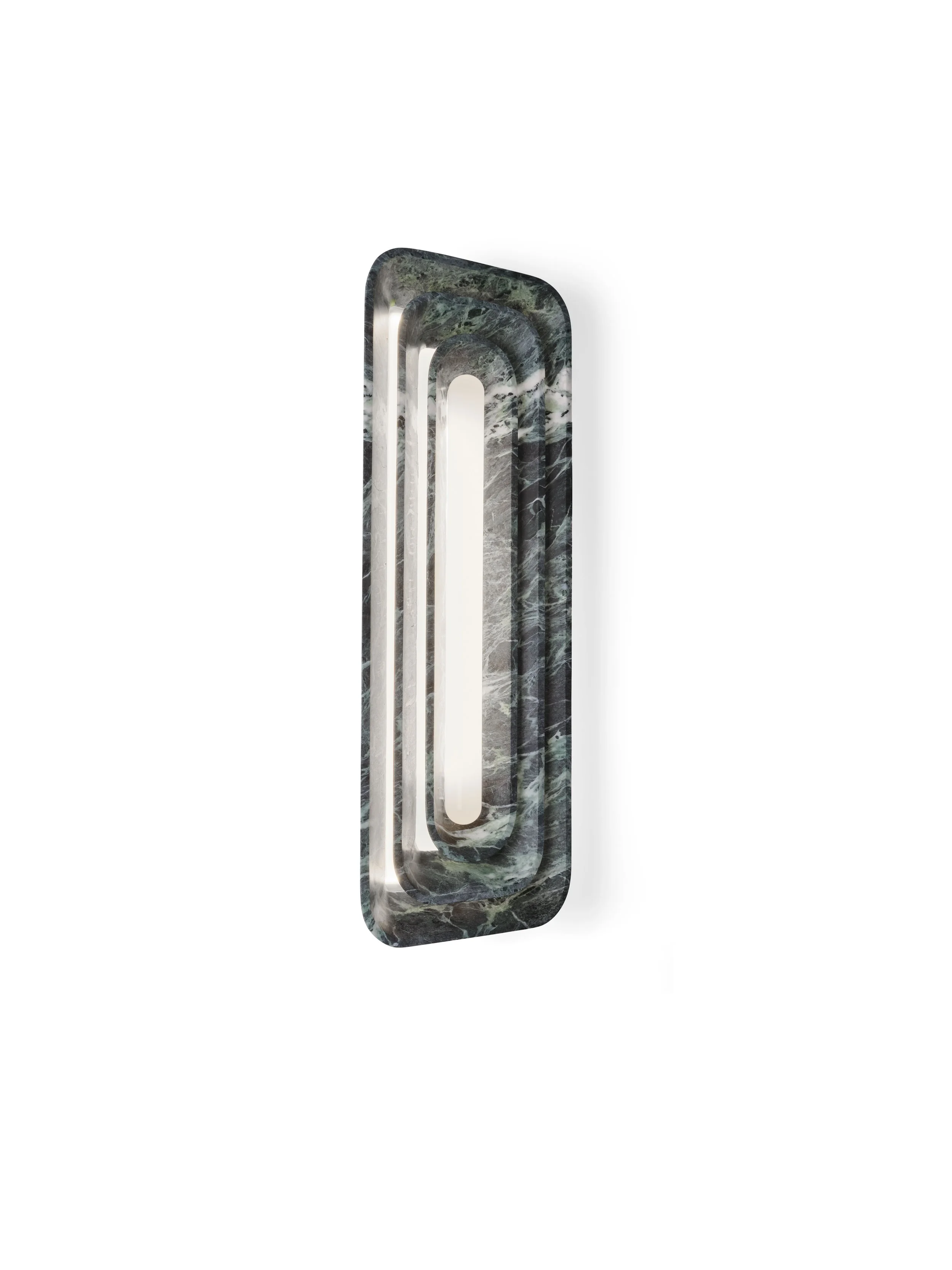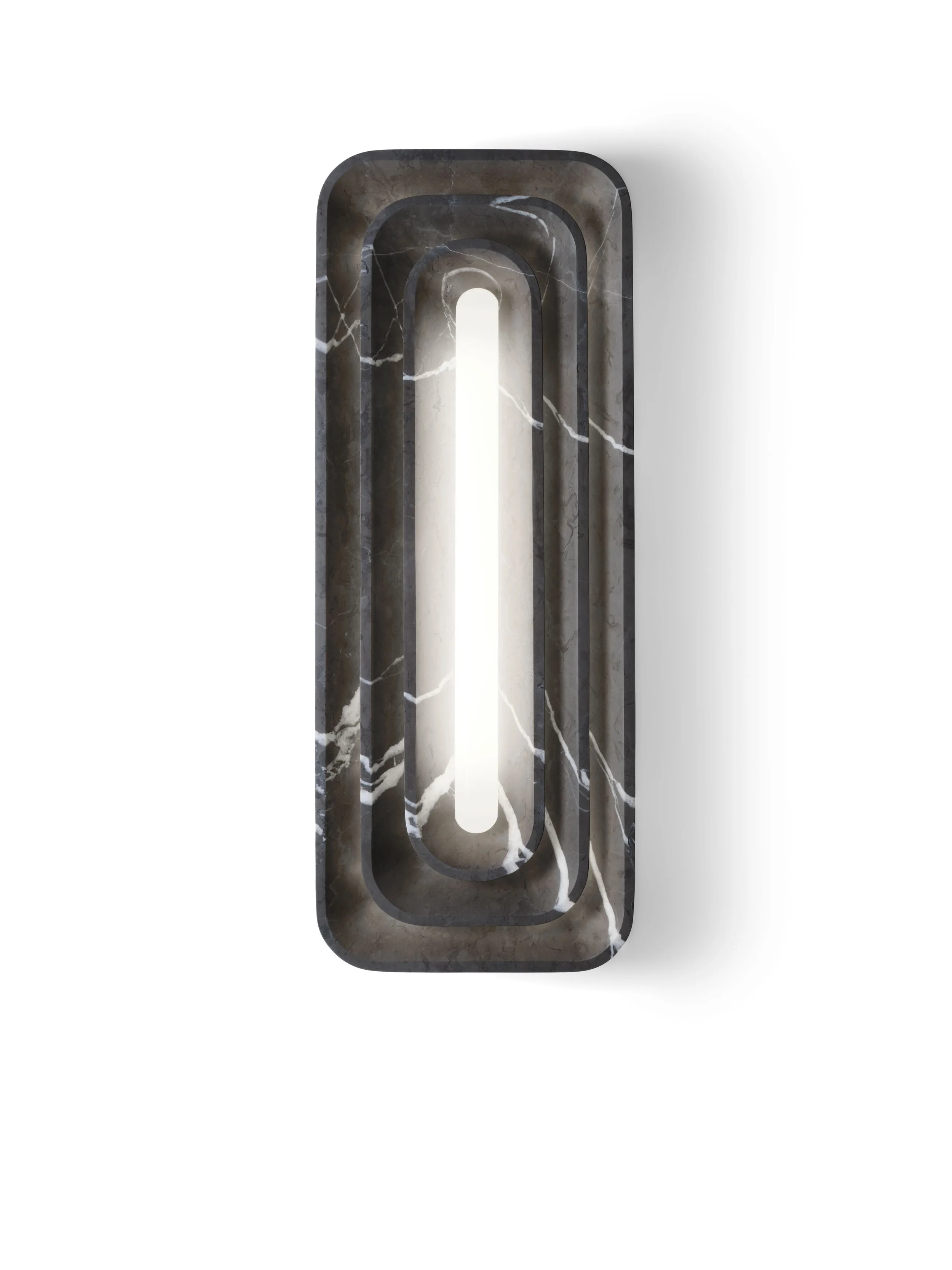 The trilogy concludes with Sfogliatella, a wall light carved from marble that feels less constructed than revealed. Layered like a natural formation, the piece encloses a concealed light source that pulses softly from within. The effect is subtle but transformative: the object becomes a living fragment of architecture, its illumination suggesting growth, metamorphosis, and quiet vitality. It is here that Ange’s interest in emotional resonance becomes most explicit—light not as function, but as narrative.